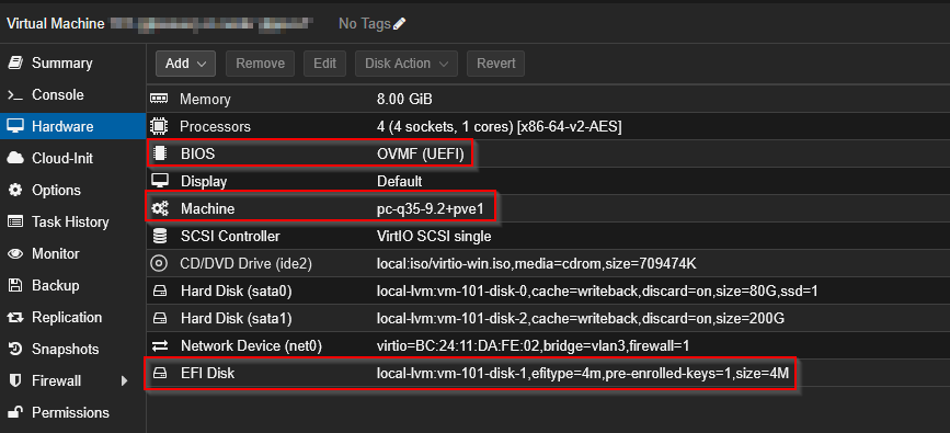 Aktivierung UEFI Mode, Q35 VM Typ und EFI Disk
